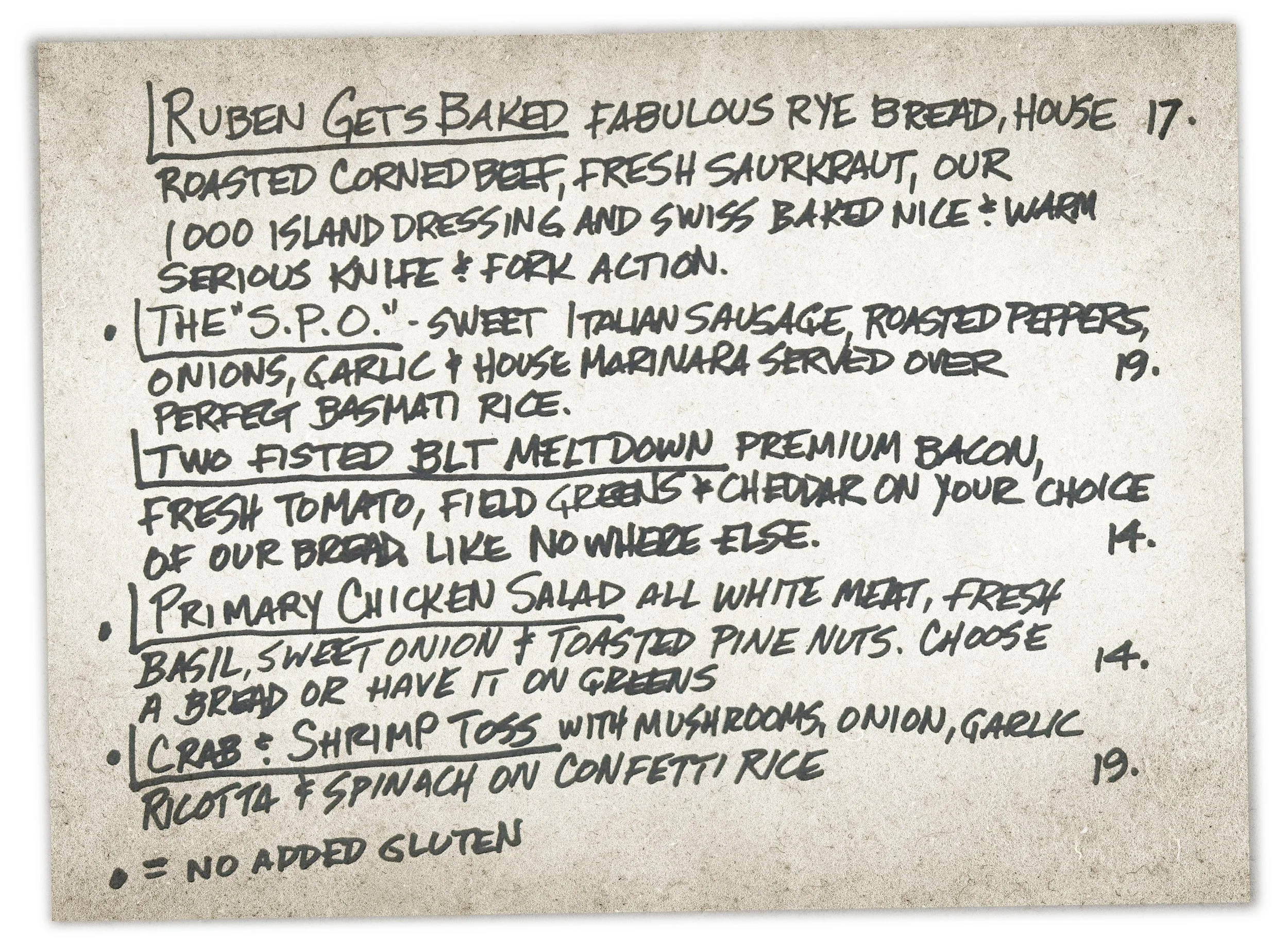 Step inside and feel instantly at home in our inviting atmosphere, where the scent of fresh bread mingles with the rich flavors of made to order selections. Every dish is crafted with passion and care, from our signature sandwiches and original entrees to our artisan desserts and warm atmosphere. All of our bread is baked on premises. Whether you're joining us for a relaxed lunch, a family dinner, or an evening with friends, you'll find exceptional service and unforgettable flavors waiting for you.